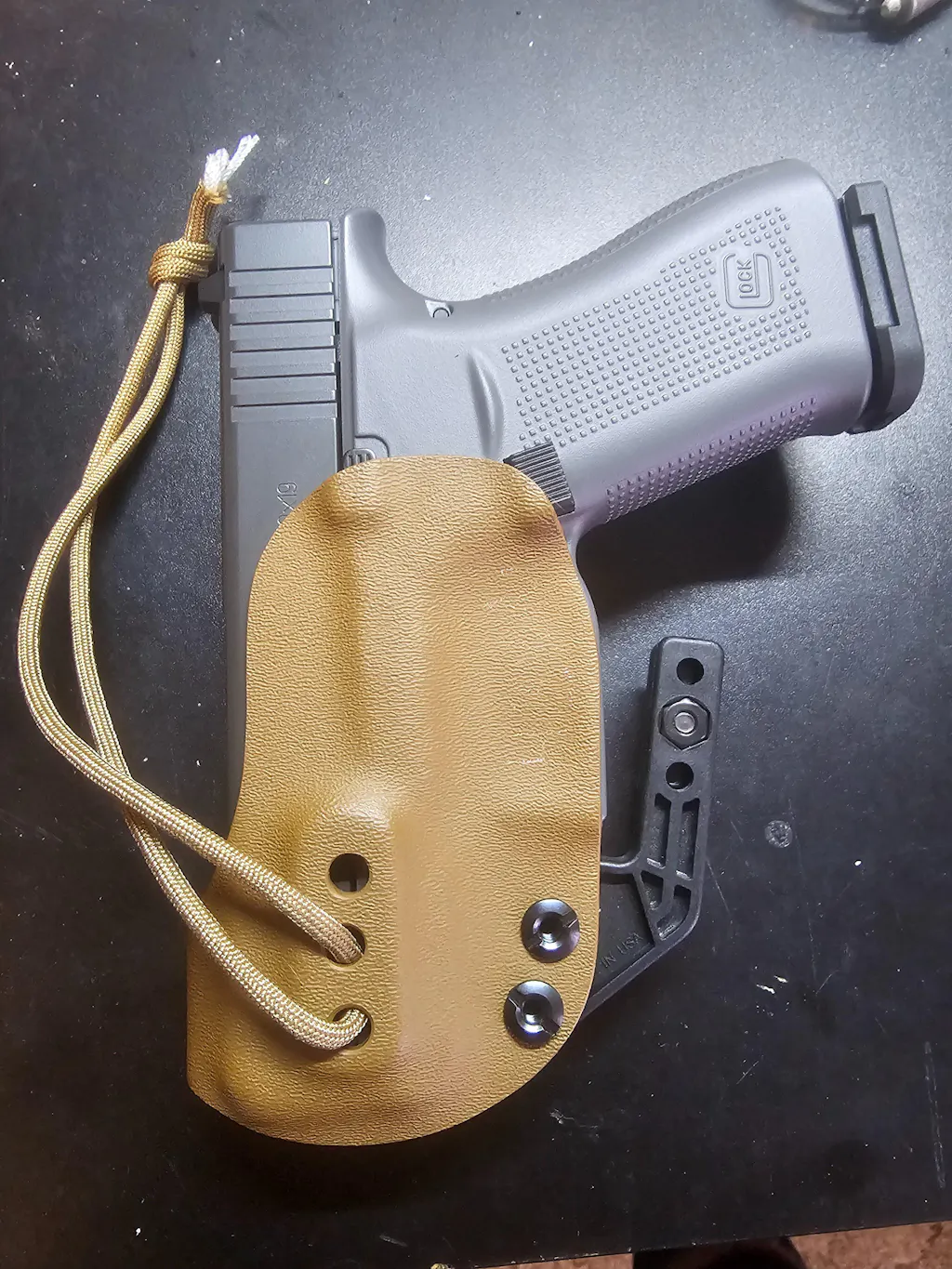 Just received the Kydex deep concealment for my 43x yesterday. Took an extra week thanks to US postal service. First impressions, its simple, real good contouring so it doesn't have sharp edges to dig in, easy to move clip height and angle for carry. I haven't messed with the para cord yet but plan on using it along with the clip as a secondary holster retention and to be able to reholster the pistol out of the pants. Now I just need to order a condom holster and try that one.